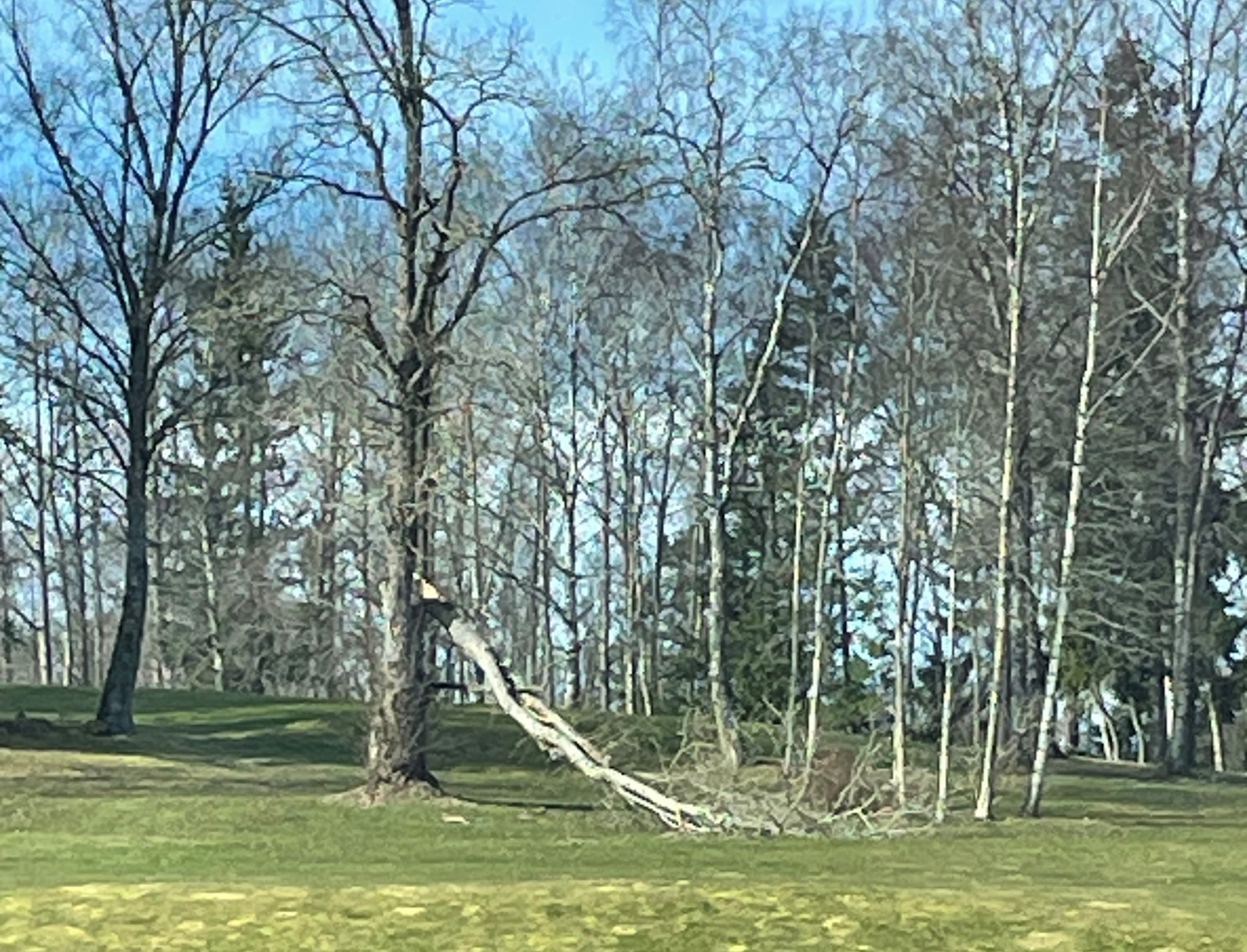 Bland annat så har flera träd blockerat vägen från hål 7 till 8 på 9-hålsbanan. Borta på hål 13 i allén är det flera träd som gått sönder och är i vägen. Även på hål 9 på 18 hålsbanan ligger det träd över fairway. Detta är bara några ställen som har drabbats av trädfällningar av naturens krafter. Men det gör att arbetet ställs på sin spets och efter en banbesiktning imorse kunde det konstateras att det är så pass mycket träd på banan och grenar och allmänt stökigt att alla resurser nu måste läggas på att få bort detta från banan.