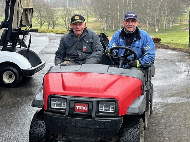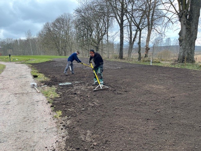 På hål 14 jobbade det strävsamma paret Stig och Staffan med att planera ut matjord inför sådd av området mellan gul och vit tee.