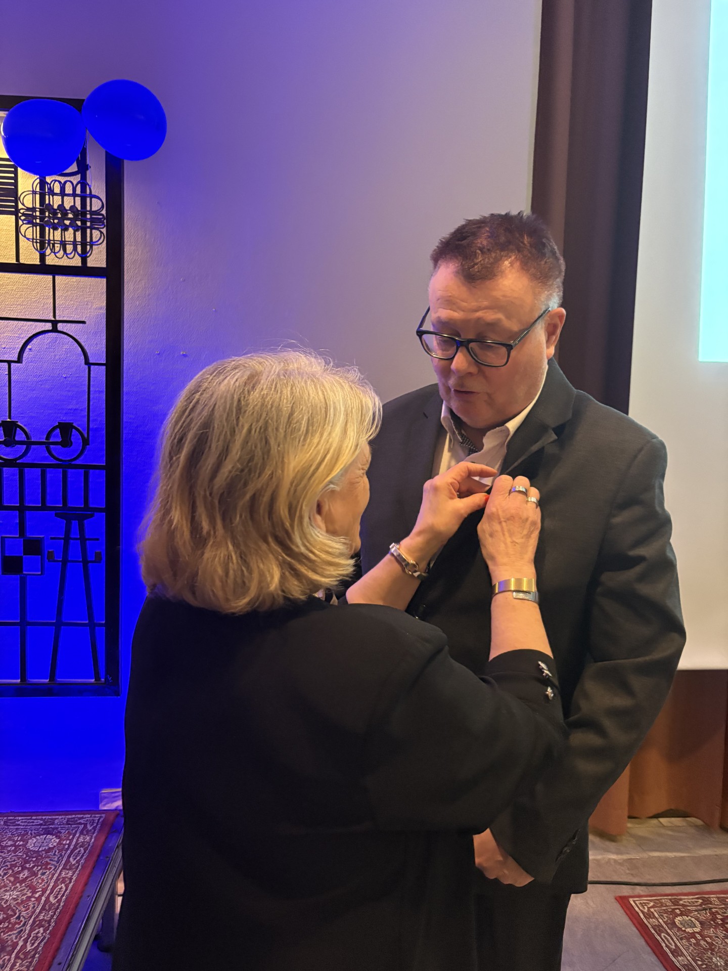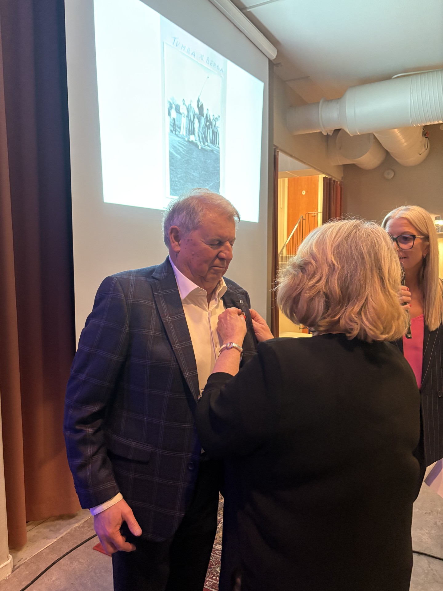 Silvernålen fästs på kavajen av styrelseledamot Annevi Dahllöf